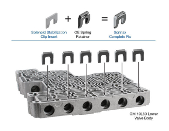 Restore proper hydraulic control by replacing worn parts with a Sonnax drop-in main pressure regulator valve kit with extended front land to restore proper clearances and flow by operating in unworn areas of the bore.Wear in the main pressure regulator bore and on the outboard spool area of the valve is common in GM 10L80 (Gen. 1) and Ford 10R80 and 10R140 transmissions. This wear minimizes line pressure control resulting in delayed shift engagement, poor shift quality and burnt clutches. Wear at the inboard spool and bore can lead to converter apply issues.