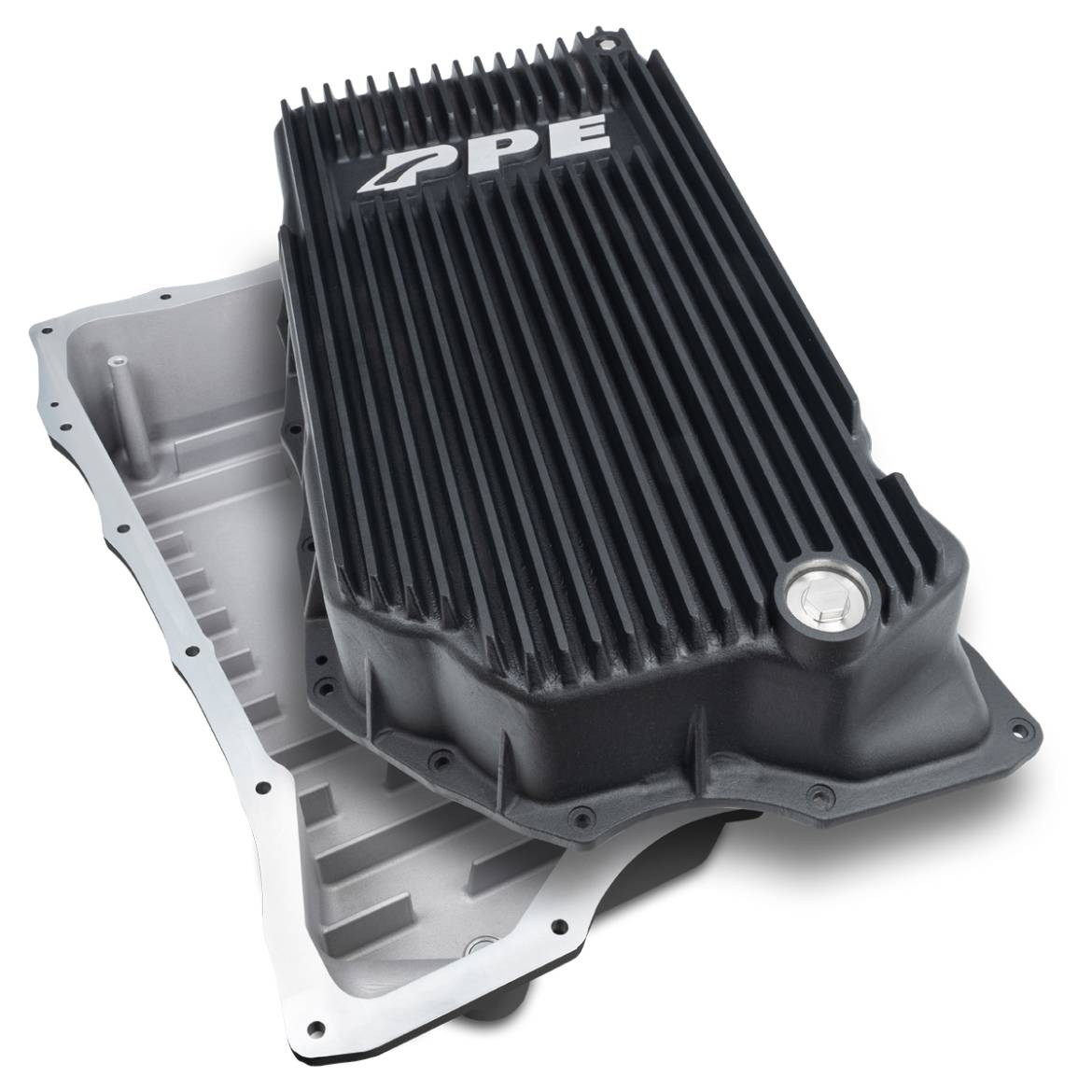 The Deep PPE Pan Increases fluid capacity by a full gallon which lowers transmission fluid temperature and increases thermal stamina. The engineered design includes cast aluminum fins and heats sinks to improve heat dissipation. The external gussets provide extra support to the machined flange to increase overall robustness.