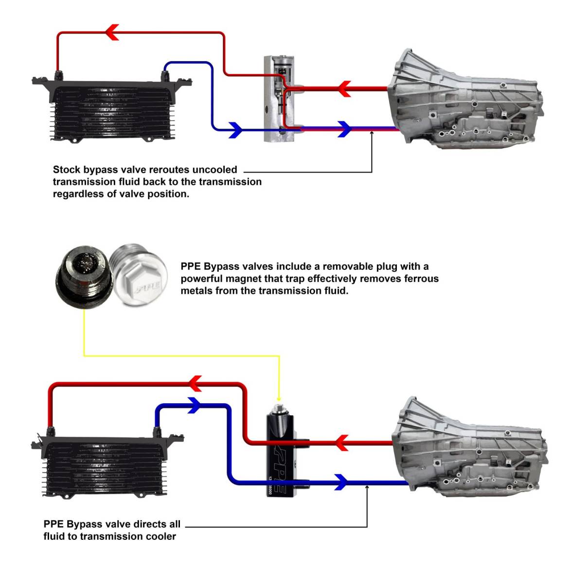 Without properly cooled transmission fluid, the demands of towing and rigorous stop-and-go driving conditions shorten the life of transmission components. The PPE Bypass Valve eliminates the extremely restrictive mechanical factory valve, maximizing fluid flow to and from the transmission cooler.