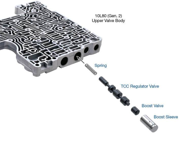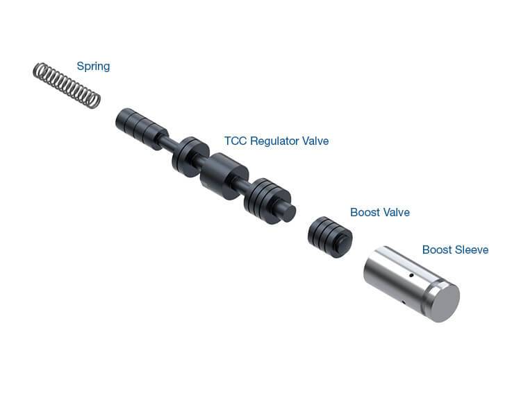 In GM Gen. 2 10L60, 10L80, 10L90 and Allison 10L1000 transmissions, the TCC regulator valve controls the application and release of the torque converter. The boost valve and sleeve assembly receives signal fluid that forces the valve to shuttle to its regulating position. In this position, the torque converter apply circuit is open to the secondary line and the torque converter release circuit is vented. This moves the converter into lockup state. Once the signal fluid is removed from the circuit, the TCC regulator valve returns to its install position where the torque converter apply circuit is disconnected from the secondary line and the torque converter release circuit is pressurized. This returns the converter to its released state.