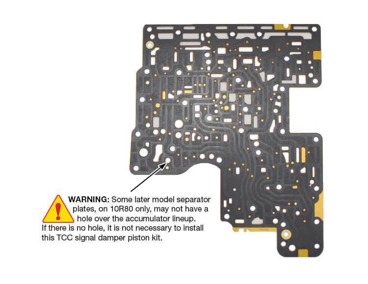 Some later model separator plates, on 10R80 only, may not have a hole over the accumulator lineup. If there is no hole, it is not necessary to install this TCC signal damper piston kit.