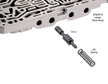 The B brake clutch in Chrysler 845RE, ZF8HP45, ZF8HP55 and ZF8HP70 transmissions is applied in Reverse, and 1st through 5th Gears, and maintains a controlled slip during neutral idle control (NIC) conditions. The B2 clutch NIC valve provides pressure to the release side of the B clutch piston - so clutch release is controlled by hydraulic pressure and not a return spring. As the B2 clutch NIC valve oscillates and strokes over time, bore deterioration results, allowing critical release pressure to be be compromised. This can cause harsh shifts, Forward and Reverse engagement concerns, flares, ratio codes and neutral idle control concerns. Reconditioning the bore and installing Sonnax oversized B2 clutch NIC valve 35740-22 revives normal shift operation by eliminating the wear that causes circuit leakage.
