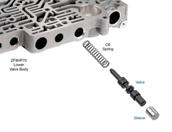 Vehicles equipped with Chrysler 845RE and ZF8HP45, ZF8HP55 and ZF8HP70 transmissions often develop erratic or high line pressure due to excessive wear in the OE pressure regulator valve bore and/or sleeve. This wear allows critical oil loss, preventing proper line pressure regulation. Without correct balance oil pressure, the PR valve will be out of its desired position, resulting in line pressure instability and possibly restricting cooler and lube flow. A deteriorated bore can cause lowered line pressure, resulting in soft shifting and burnt clutches. Reconditioning the bore and installing Sonnax oversized pressure regulator valve kit 35740-01K renews pressure regulator action for revived line pressure control in all ranges.
