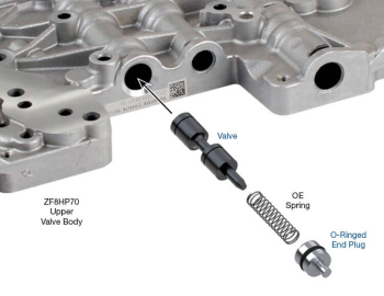 Vehicles equipped with Chrysler 845RE and ZF8HP45, ZF8HP55 and ZF8HP70 transmissions may have TCC problems such as harsh apply, excess slip, lining failure and related trouble codes. These issues are often the result of bore wear at the TC pressure valve, which allows critical control pressure to escape the circuit. Leakage here can also cause a 2-1 downshift clunk and diminished lube oil flow. Reconditioning the bore and installing Sonnax oversized TC pressure valve kit 35740-18K eliminates bore leakage for renewed TC and lube control.