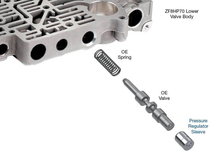 Vehicles equipped with ZF8HP45, ZF8HP55, ZF8HP70 and Chrysler 845RE transmissions often develop erratic or high line pressure due to excessive wear in the OE pressure regulator sleeve. This wear allows balance oil loss, preventing proper line pressure regulation. Without correct balance oil pressure, the PR valve will be out of its desired position, resulting in line pressure instability and possibly restricting cooler and lube flow. Installing Sonnax pressure regulator sleeve 35740-03 renews pressure regulator action for revived line pressure control in all ranges.