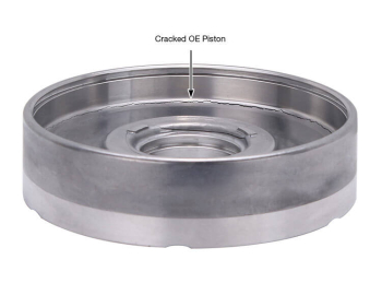 Overdrive "E" pistons in ZFHP26 and Ford 6R60, 6R75 and 6R80 transmissions commonly crack at the outer diameter of the apply area due to manufacturing defects and/or high stress areas from the die cast process.