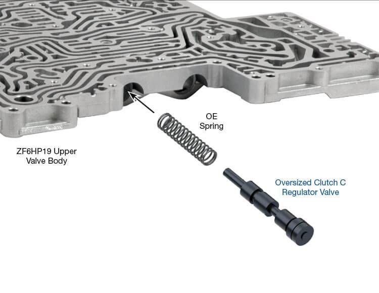 In listed Ford and ZF6 transmissions, clutch C is applied in 2nd and 6th Gears. As the clutch C regulator valve oscillates and strokes over time, bore deterioration results, allowing pressure loss that prevents proper hydraulic control of the clutch. This can cause slipping, ratio codes, poor shift quality in 2nd and 6th Gears as well as clutch C failure.