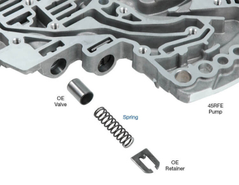 Harsh TCC engagement complaints can occur due to breakage of the TCC accumulator spring in the pump assembly in Chrysler 45/545/65/66 and ’18-earlier 68RFE units. The OE spring material and design is overstressed in this application. Sonnax TCC accumulator spring 44912-01 is manufactured from an upgraded material to increase spring strength and resiliency.