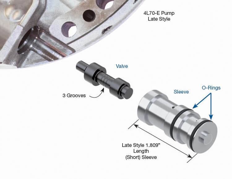 GM 4L60-E, 4L65-E and 4L70-E transmissions frequently have poor line rise, which can result in 3-4 clutch, 2-4 band failure or poor shift quality. The duty cycle of the EPC solenoid causes the boost sleeve to wear quickly. Oil entering the torque signal orifice leaks past the boost valve and exhausts at the Reverse orifice, resulting in poor line rise. Reverse oil can exhaust both to the sump and back through the torque signal orifice. The outside diameter of the boost sleeve also allows some leakage through the pump body, which decreases pressure rise.
