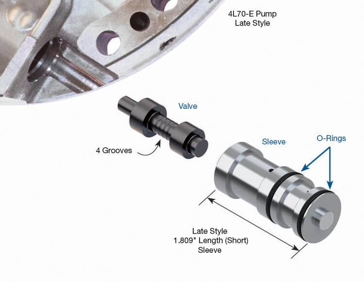 GM 4L60-E, 4L65-E and 4L70-E transmissions frequently have poor line rise, which can result in 3-4 clutch, 2-4 band failure or poor shift quality. The duty cycle of the EPC solenoid causes the boost sleeve to wear quickly. Oil entering the torque signal orifice leaks past the boost valve and exhausts at the Reverse orifice, resulting in poor line rise. Reverse oil can exhaust both to the sump and back through the torque signal orifice. The outside diameter of the boost sleeve also allows some leakage through the pump body, which decreases pressure rise.