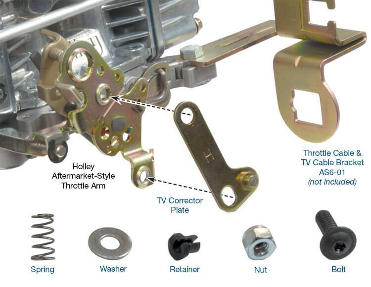 This kit is only suited for carburetors with Holley aftermarket-style throttle arm as shown in main figure. This kit is not intended to work with throttle arms on OE Holley carburetors or other Holley full-race styles of throttle arm.