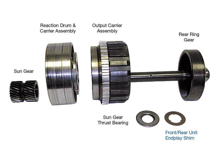 It is often difficult to reduce front unit endplay on GM TH400 or 4L80-E and 4L85-E units with excessive spline wear. Normal component wear allows excess forward and direct drum travel. This travel or free-play reduces sealing ring life. These units are limited on the thickness of pump shim material that can be added. Excessive shimming at the pump will push the forward drum off the rings and result in a burnt forward clutch. Sonnax offers .010" thick front/rear unit endplay shim 34500-Z that can be stacked under the sun gear bearing race.