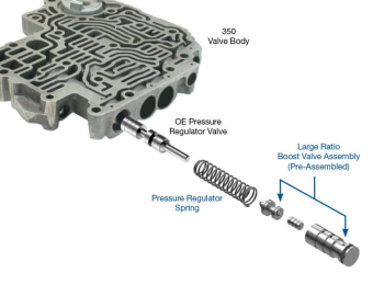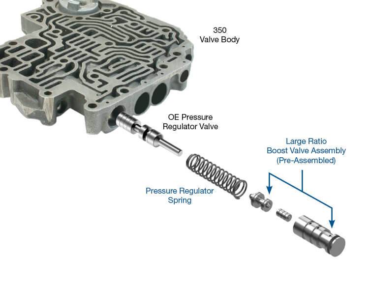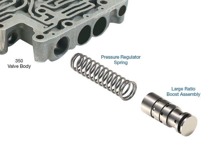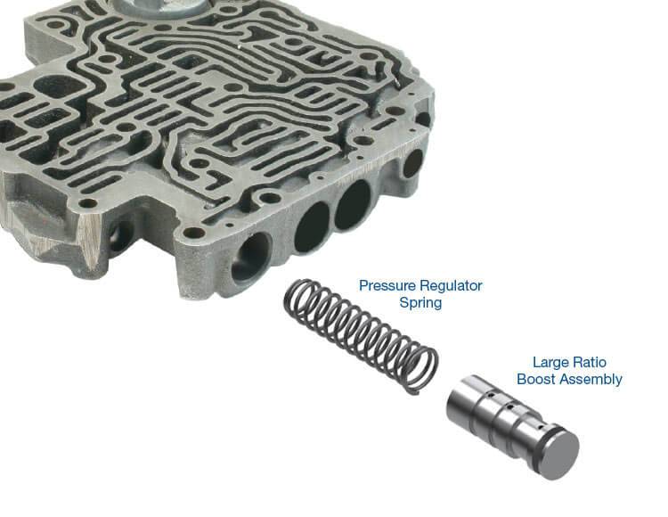 Sonnax hydraulic line pressure booster kits contain stronger pressure regulator springs and large ratio boost valves designed to work together to provide progressive pressure increases as driving conditions become more demanding.