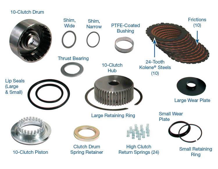 Sonnax 10-clutch drum kit with bearing 28756-08K is a complete drum kit that includes all high clutch related components, including a pump-to-drum bearing and shim, plus a pre-installed, PTFE-coated bushing. The Sonnax drum has material removed for the kit's bearing, allowing overall stack up to be .060" taller than an OE drum alone.
